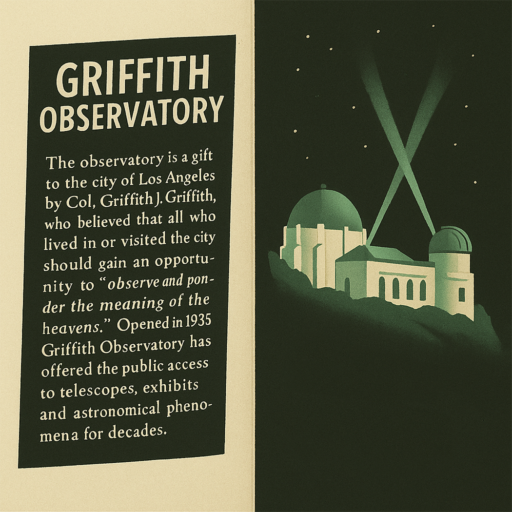 A stylized travel brochure for Griffith Park Observatory, inspired by 1930s art deco design. Featuring hand-drawn, airbrushed illustrations, it merges the magic of astronomy and old Hollywood into a dreamy visual journey through Los Angeles' most iconic landmark.